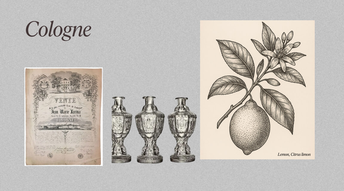 Eau de Cologne is zowel een concentratie (zoals Eau de Toilette, Eau de Parfum en Parfum) als een historische stijl uit het begin van de 18e eeuw. Het “water uit Keulen” dat Johann Maria Farina in 1709 creëerde, werd al snel een Europese sensatie. De basis bestaat altijd uit citrus, gecombineerd met mediterrane kruiden en bloemige accenten. Tegenwoordig worden colognes meestal gerekend tot de moderne geurfamilie citrusparfums.