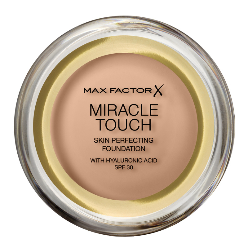 Miracle Touch Foundation van Max Factor is een medium tot hoog dekkende foundation die een snel en dekkend resultaat geeft met een natuurlijke gloed. Miracle Touch Foundation is verrijkt met hyaluronzuur en SPF 30. Het bijgeleverde sponsje is van zeer goede kwaliteit en met een paar simpele vegen krijgt je een egale, stralende en onberispelijke teint. Miracle Touch transformeert bij contact met de huid - van vast naar vloeibaar en geeft vervolgens een fluweelzachte, poederachtige finish.